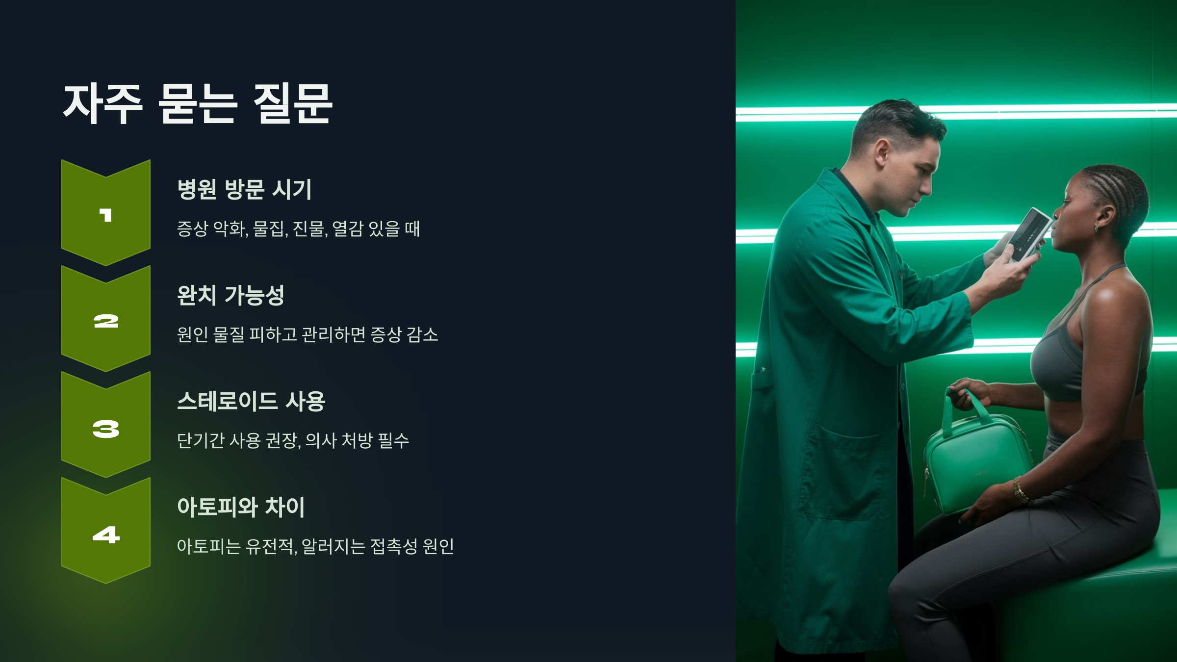 A1. 가벼운 증상이라면 항히스타민제나 보습제로 관리할 수 있어요. 하지만 증상이 악화되거나 물집, 진물, 열감이 있다면 피부과를 방문하는 것이 좋아요.