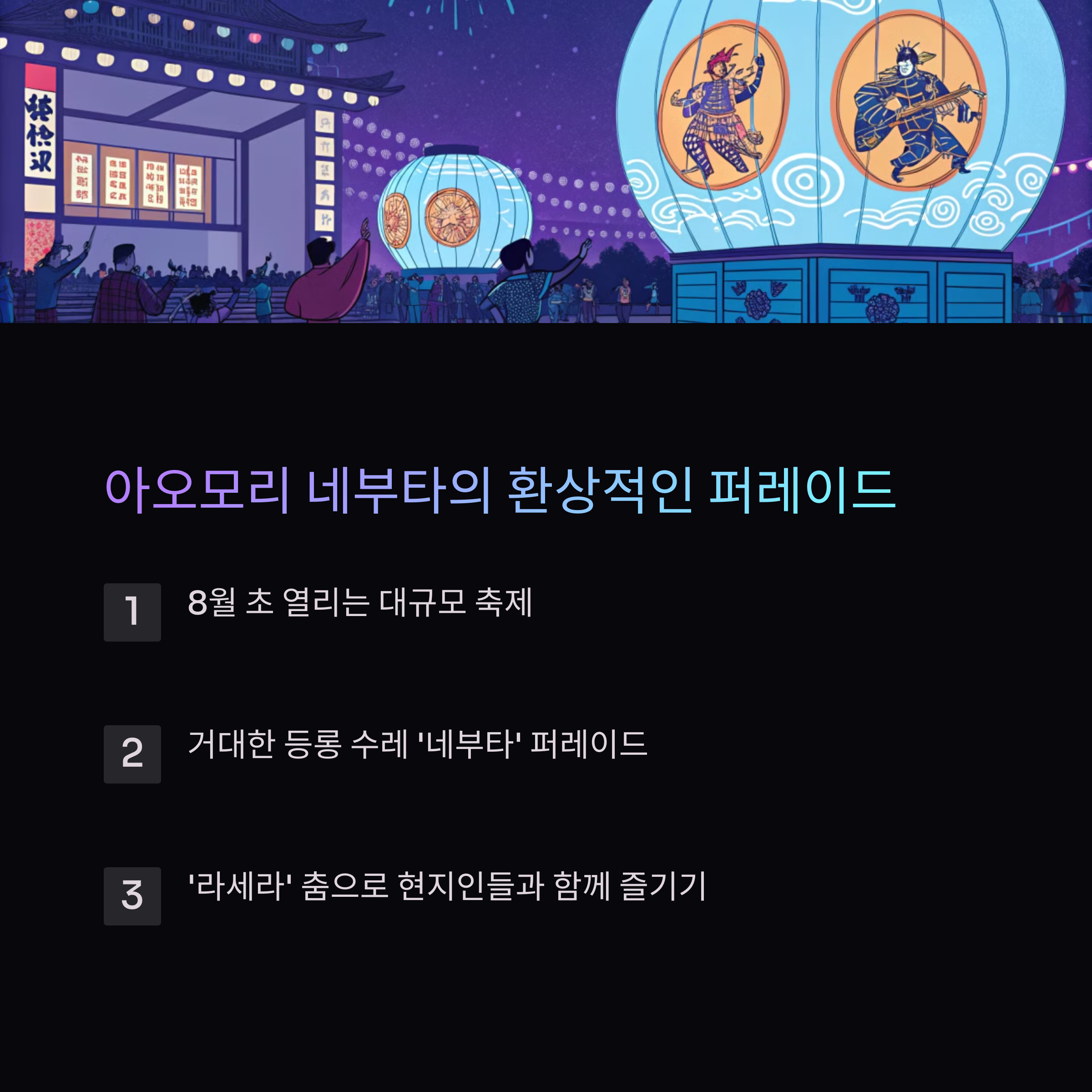 일본에서 가장 화려한 여름 축제 중 하나인 아오모리 네부타 마츠리(青森ねぶた祭)는 매년 8월 초 아오모리현에서 열려요. 거대한 등불 조형물(네부타)이 밤하늘을 밝히며 도시를 행진하는 장면은 정말 장관이랍니다! 🏮✨