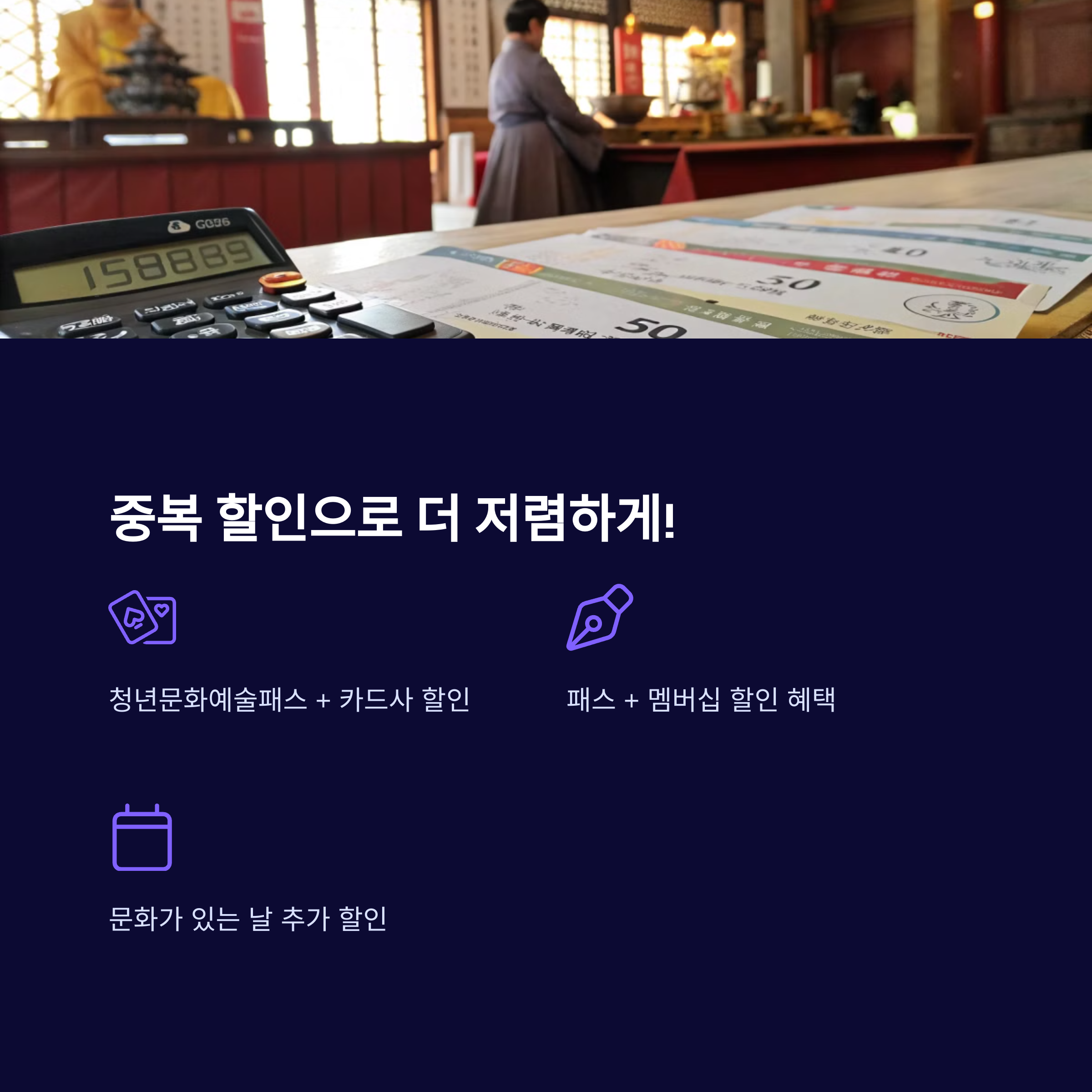 청년문화예술패스만으로도 큰 할인 혜택을 받을 수 있지만, 다른 할인과 중복 적용하면 더욱 저렴하게 공연과 전시를 즐길 수 있어요! 🎟️