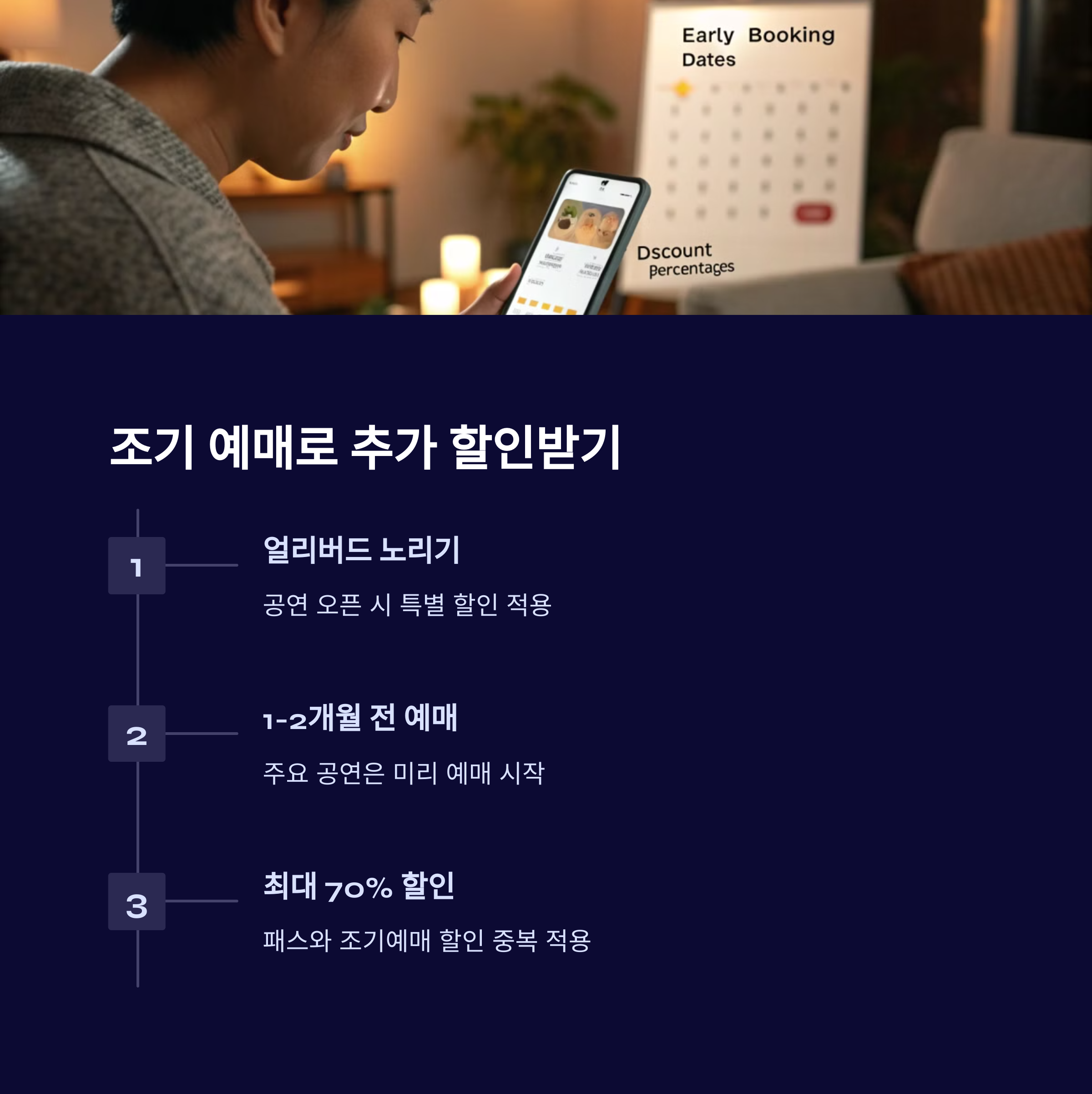 | 조기 예매 (공연 2~3개월 전) | 최대 50% | 뮤지컬, 오페라, 클래식 | 한정 수량으로 제공 |