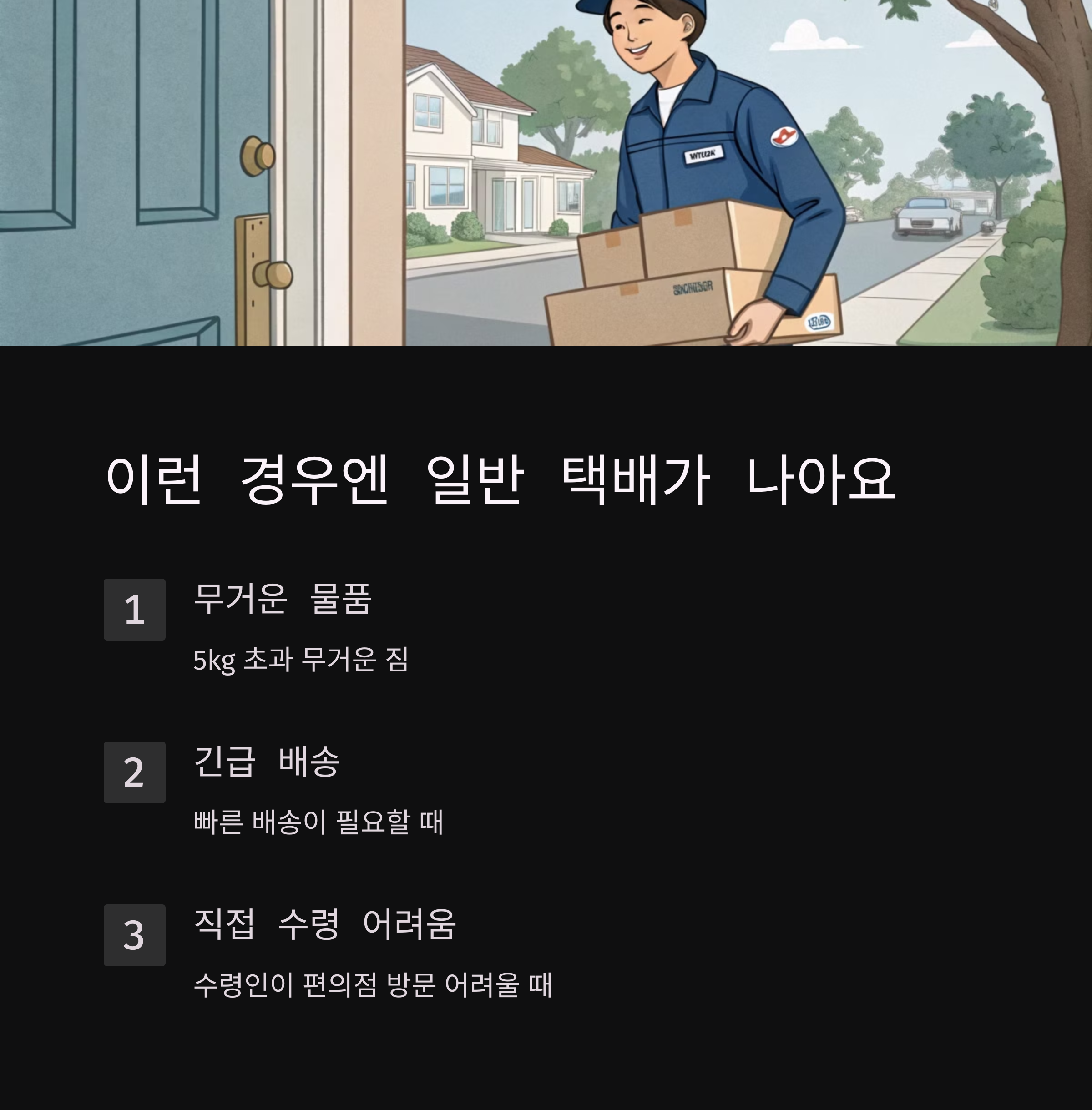 - 🚚 **5kg 이상의 무거운 물건은 일반 택배가 더 나을 수도 있음**