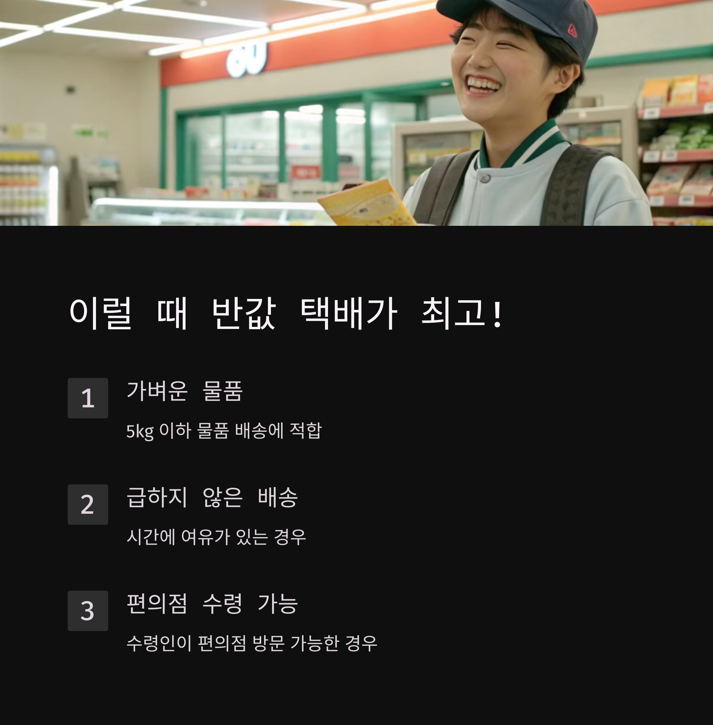 즉, **편의점에서 직접 접수하고 배송 속도를 조정**하는 방식으로 반값 택배는 저렴한 가격을 유지할 수 있는 거예요! 📦
