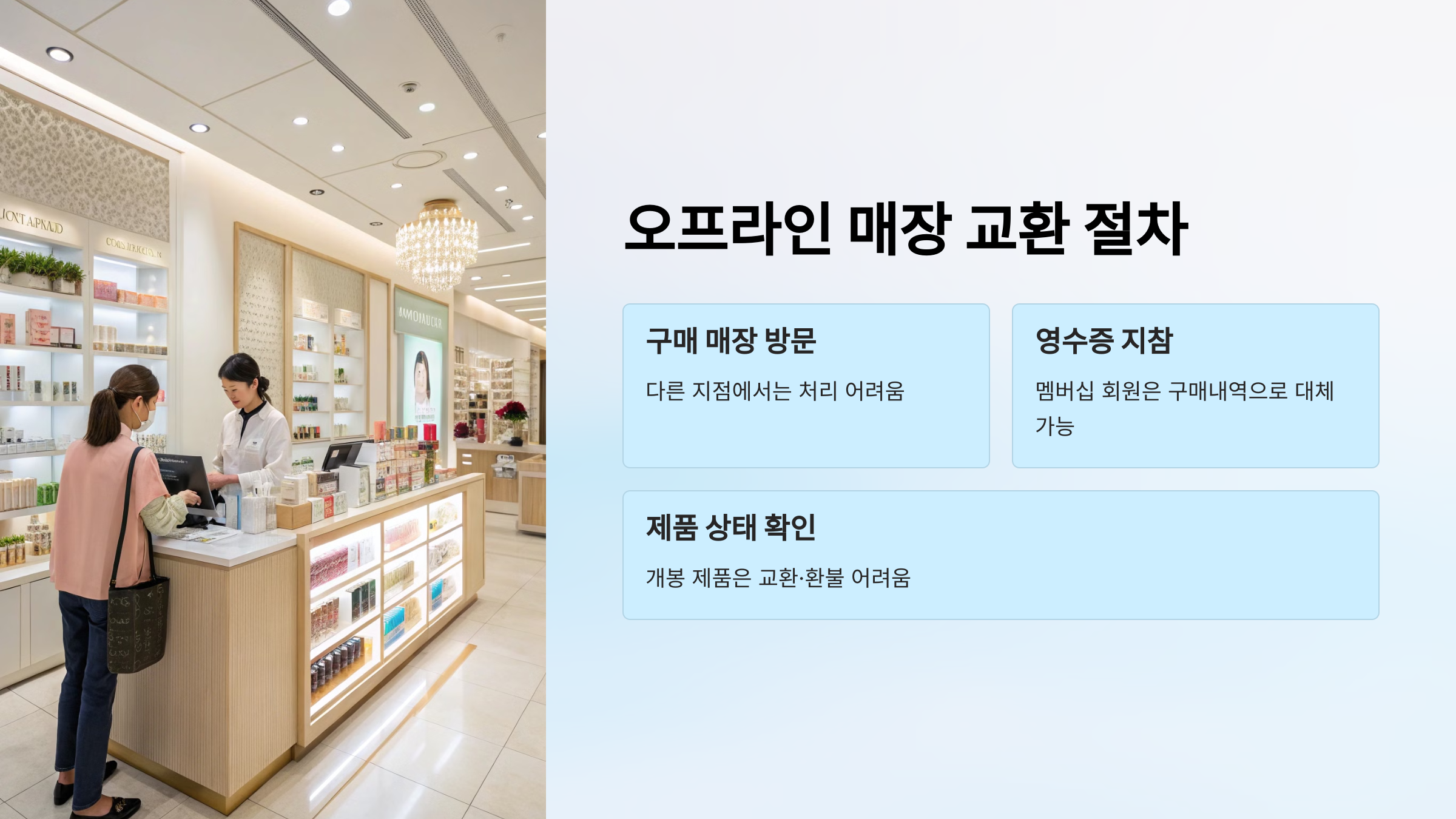 오프라인 매장에서 구매한 제품은 해당 매장에서만 교환·환불이 가능해요. 다른 지점에서는 처리가 어려울 수 있으니, 가능하면 구매한 매장을 방문하는 게 좋아요.