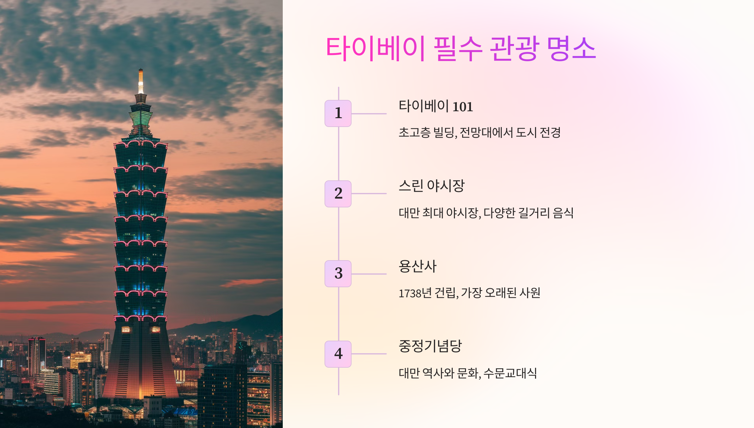 이처럼 대만은 다양한 매력을 가진 도시들이 많아요. 여행 스타일에 맞게 일정을 짜면 만족스러운 여행이 될 거예요! ✨