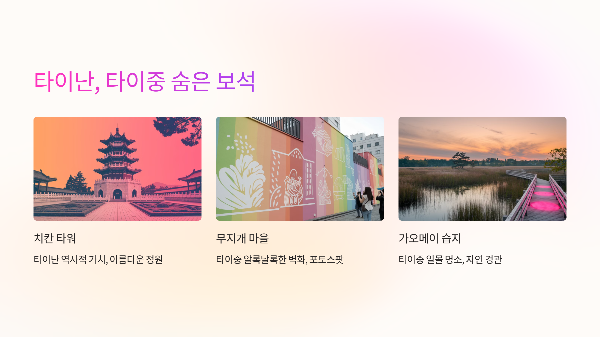 2. 타이중 (Taichung): 예술과 자연을 동시에 즐길 수 있는 도시예요. 특히 무지개마을과 가오메이 습지는 인생 사진을 찍기 좋은 곳이에요.