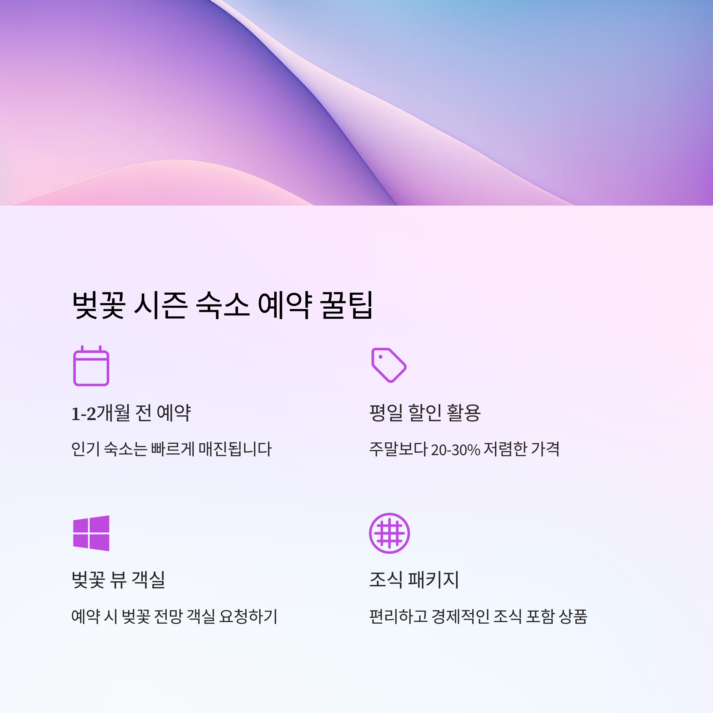1박 2일 동안 벚꽃을 더욱 여유롭게 즐기고 싶다면 숙소 예약도 중요해요. 다음 섹션에서는 벚꽃 시즌 숙소 예약 꿀팁을 알려드릴게요! 🛏