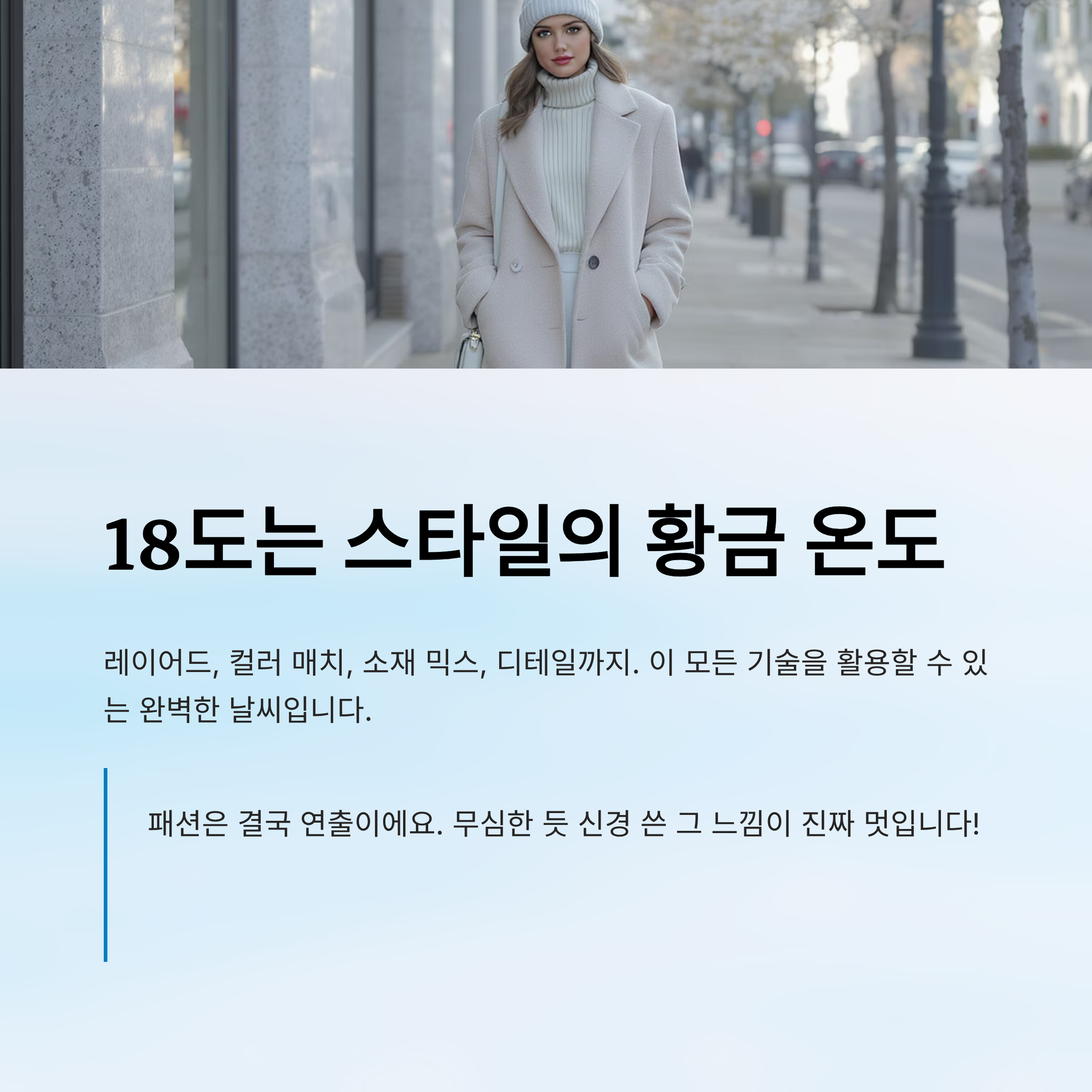 내가 생각했을 때, 이때 가장 스타일리시하게 보일 수 있는 온도는 18도예요. 너무 춥지 않아서 아우터도 다양하게 활용 가능하고, 그렇다고 덥지도 않아서 레이어드해도 부담 없거든요. 결국은 이 온도가 스타일링 실력을 테스트하는 날씨인 거죠! 👀