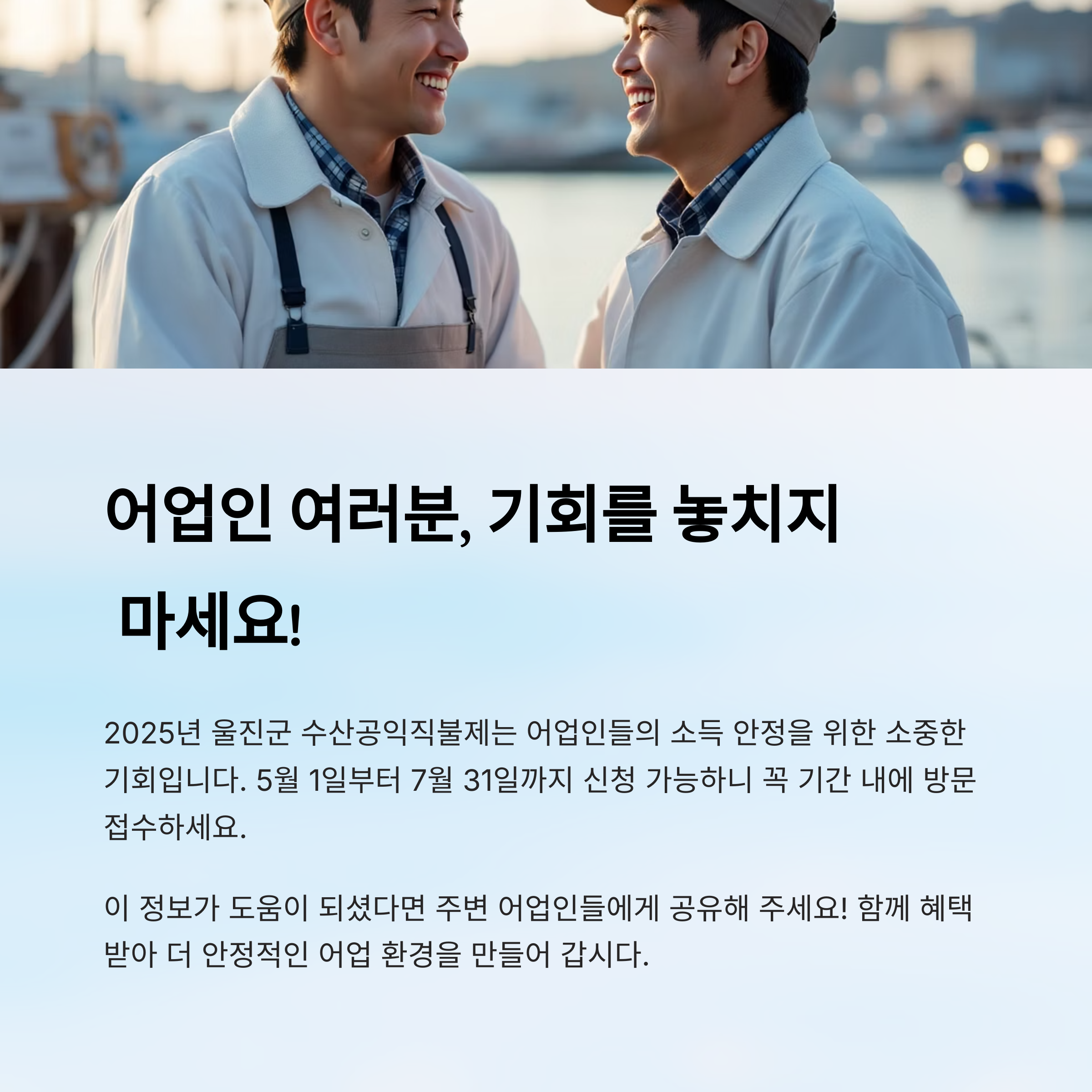 조건이 다소 까다롭게 느껴질 수 있지만, 실제로 어업에 종사하고 있는 분이라면 충분히 충족 가능한 요건이에요. 혹시 자격 조건이 애매하다면, 관할 읍·면 행정복지센터나 울진군 해양수산과에 미리 문의해보는 것도 좋아요! ☎️