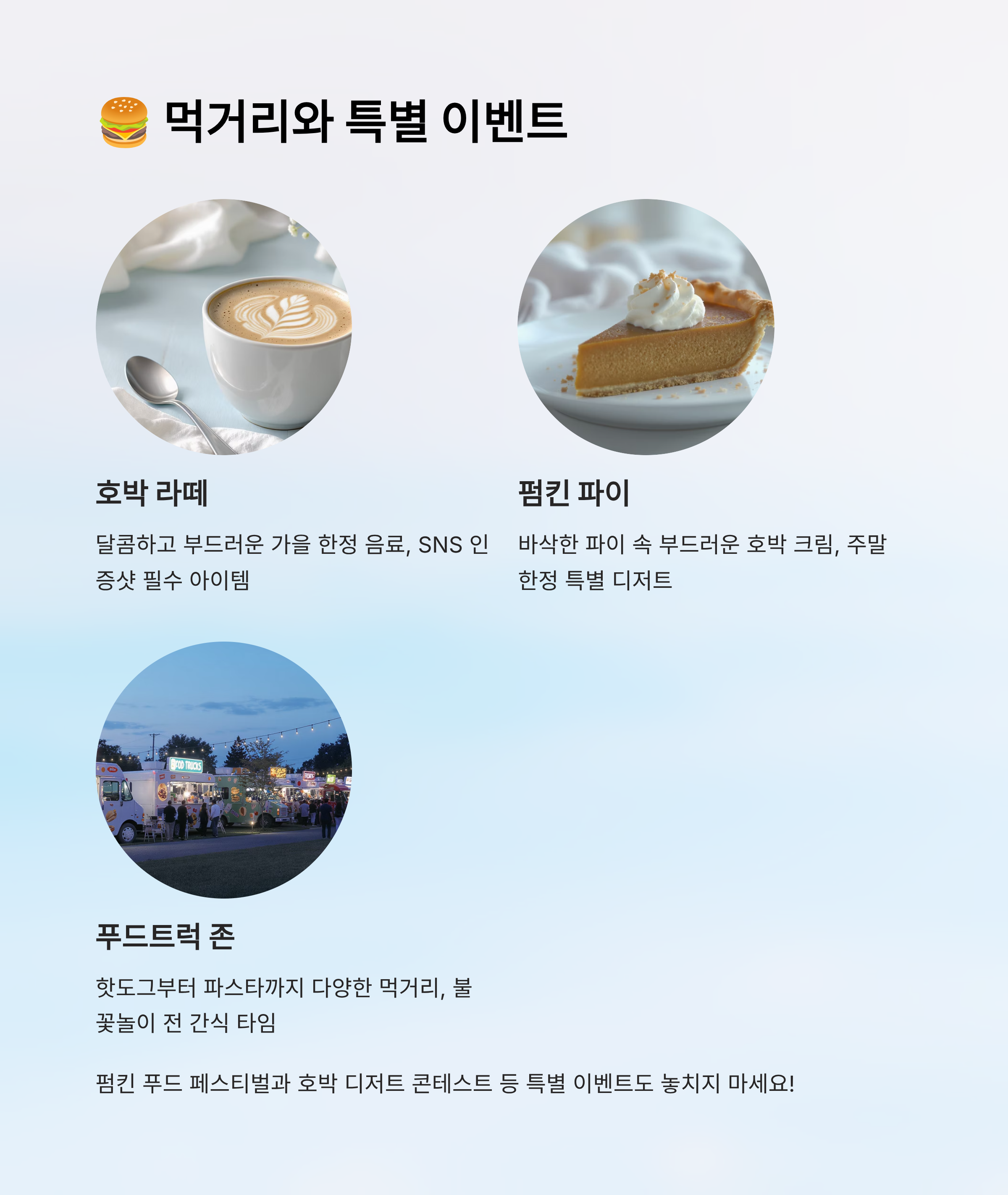 | 호박 라떼 | 달콤하고 부드러운 가을 음료 | 커피·라떼 마니아 | 축제 기간 상시 |