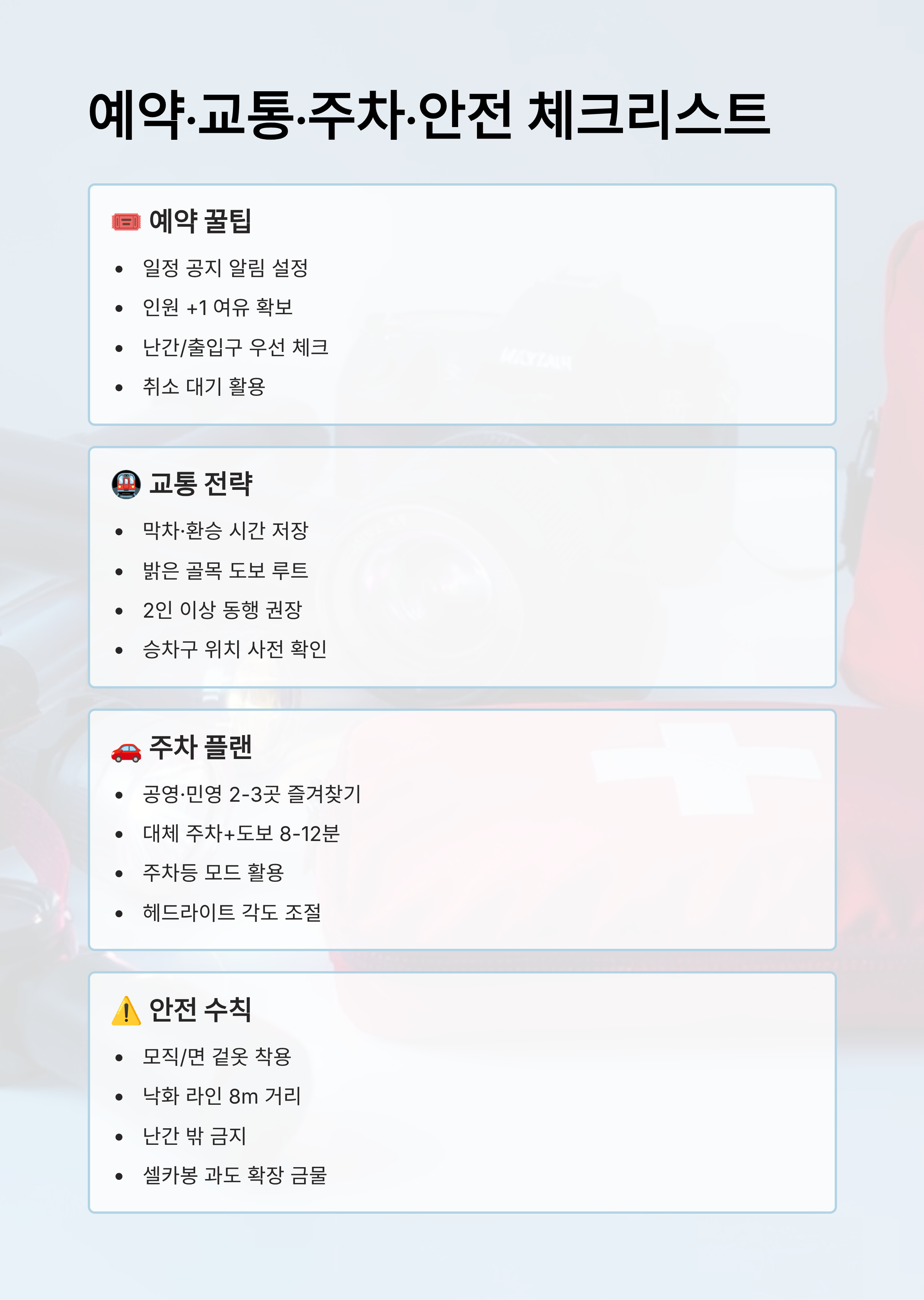 🎟️ 지금 바로 할 일: (1) 일정 알림 등록 (2) 명당 3곳 지도 저장 (3) 미니 LED·보조배터리 챙기기 (4) 동행과 포즈 3종 합의. 이 4가지만 해도 인생샷 확률이 확 올라가요!