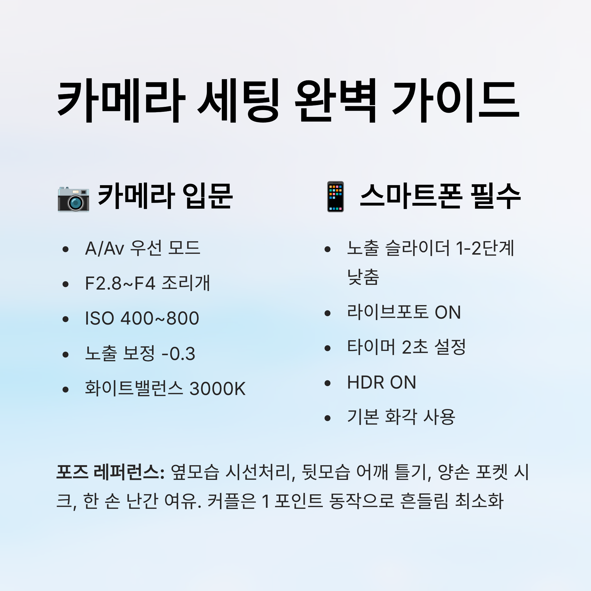 카메라 세팅(입문): M 대신 A/Av 우선, F2.8~F4, ISO 400~800, 노출 보정 -0.3. 스마트폰 세팅: 노출 슬라이더 1~2단계 낮춤, 라이브포토 ON, 타이머 2초, HDR ON. 셀카는 초광각보다 기본 화각이 왜곡이 적어요.