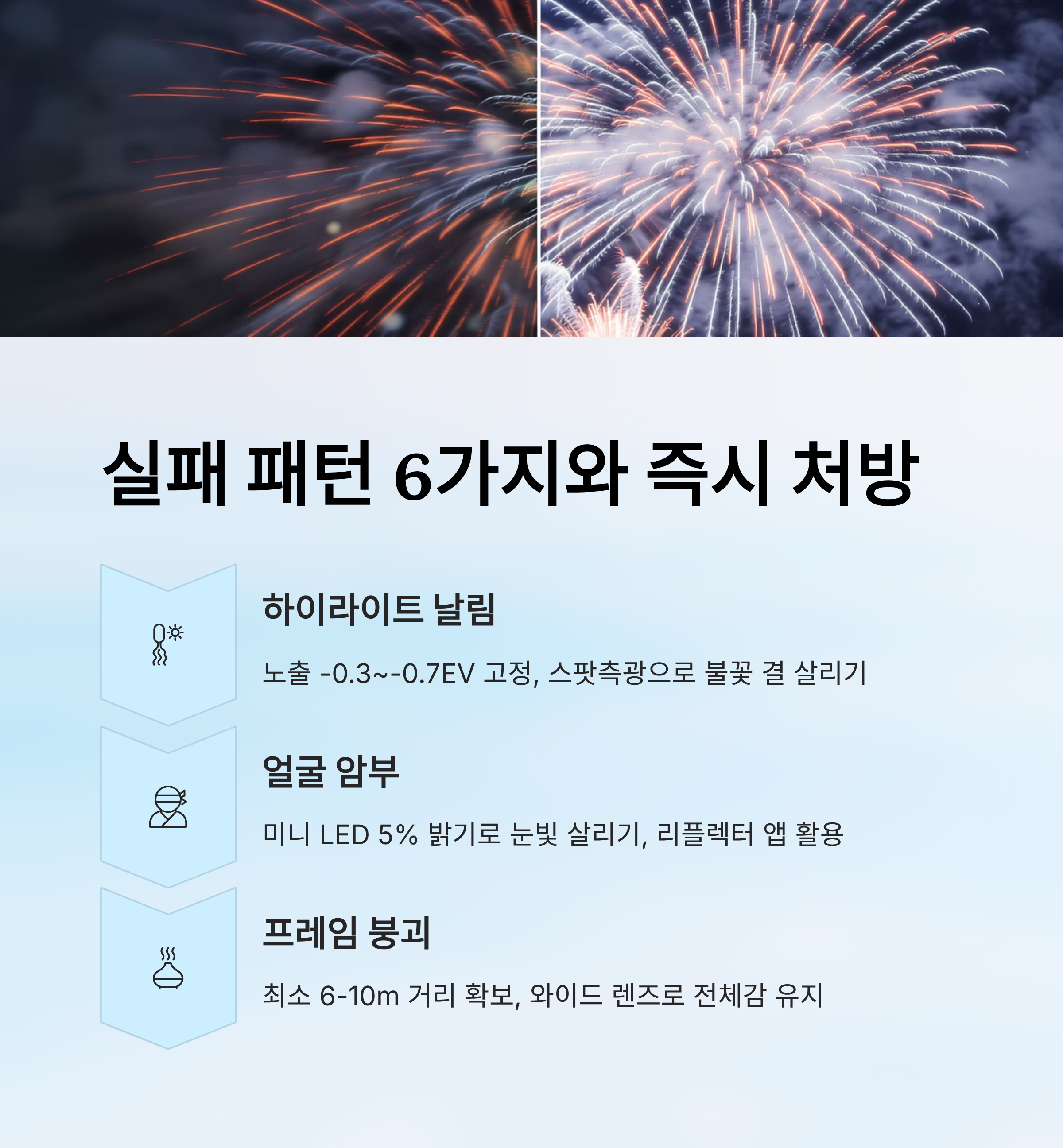 | 하이라이트 날림 | 오버노출 | -0.3~-0.7EV | 스팟측광 | 불꽃 결 살림 |
