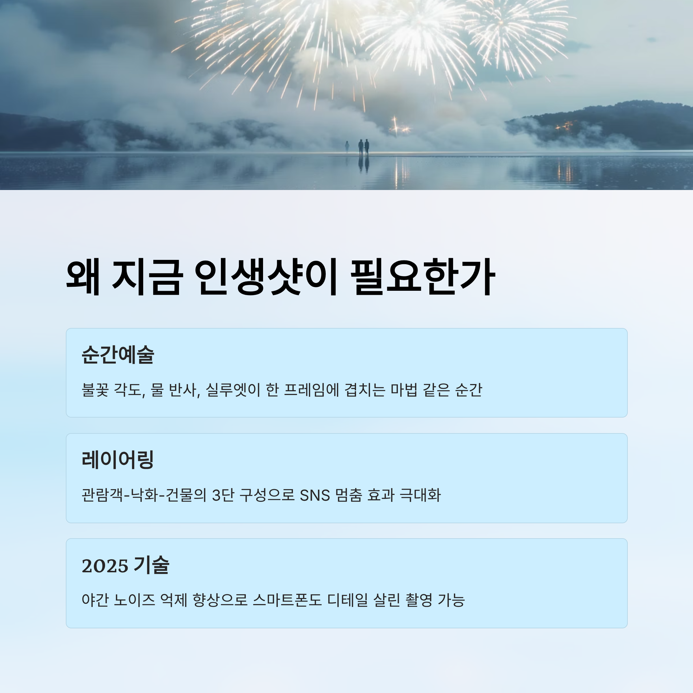 SNS에서 반응이 큰 샷은 공통 공식이 있어요. ① 반사 대칭 ② 사람 실루엣 ③ 네온 보케 ④ 불꽃 커튼 ⑤ 브릿지 프레임. 이 중 최소 2가지를 조합하면 좋아요. 예를 들어 ‘브릿지 프레임+실루엣’은 얼굴 노출을 신경 덜 써도 완성도가 높아요.