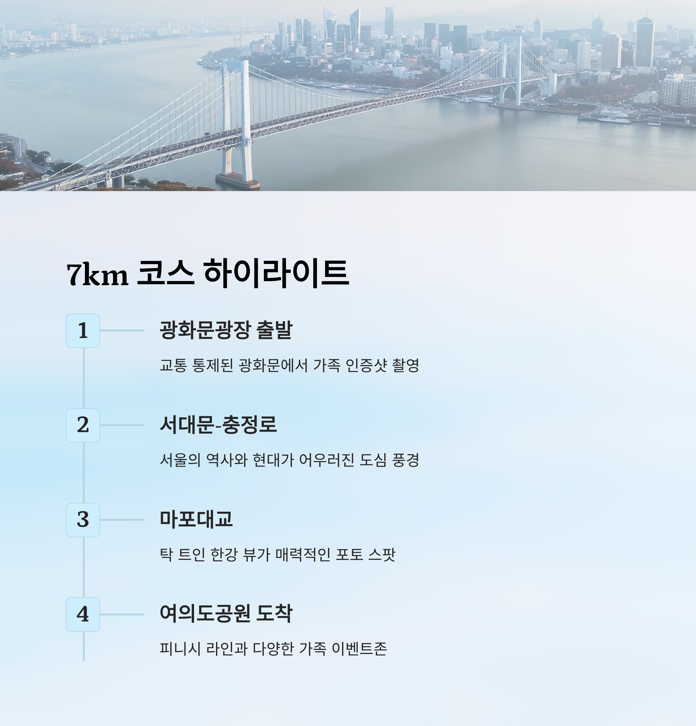 전체 거리는 약 7km이며, 광화문광장을 출발해 광화문사거리, 서대문, 충정로, 공덕역, 마포역, 마포대교를 건너 여의도공원 문화의마당에서 피니시하게 돼요. 코스는 완만한 경사로로 구성돼 있어서 유아차를 끌고 이동하기에도 큰 무리가 없어요.