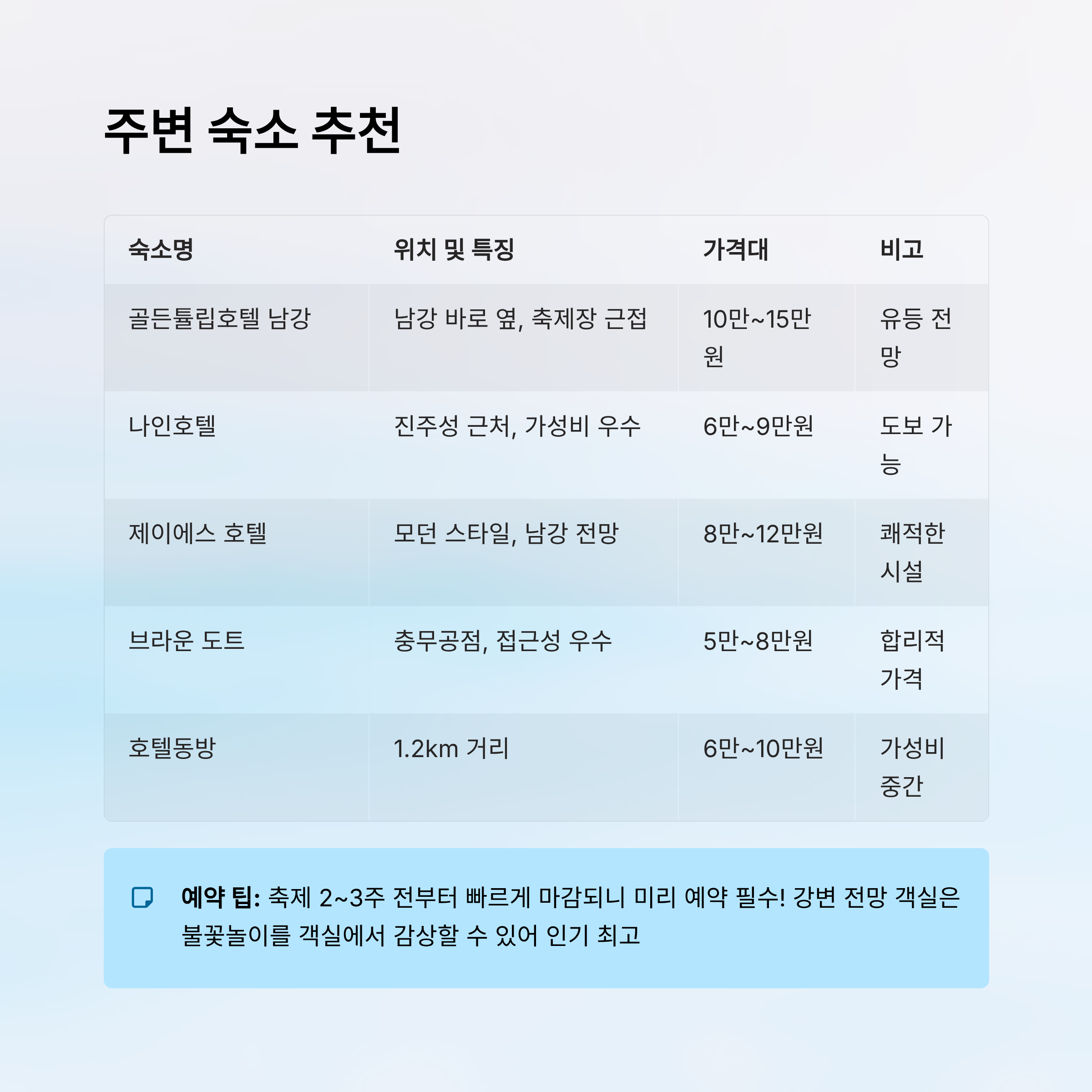 | 골든튤립호텔 남강 | 남강 바로 옆, 축제장 근접 | 10만~15만 원 | 유등, 불꽃놀이 감상 가능 |