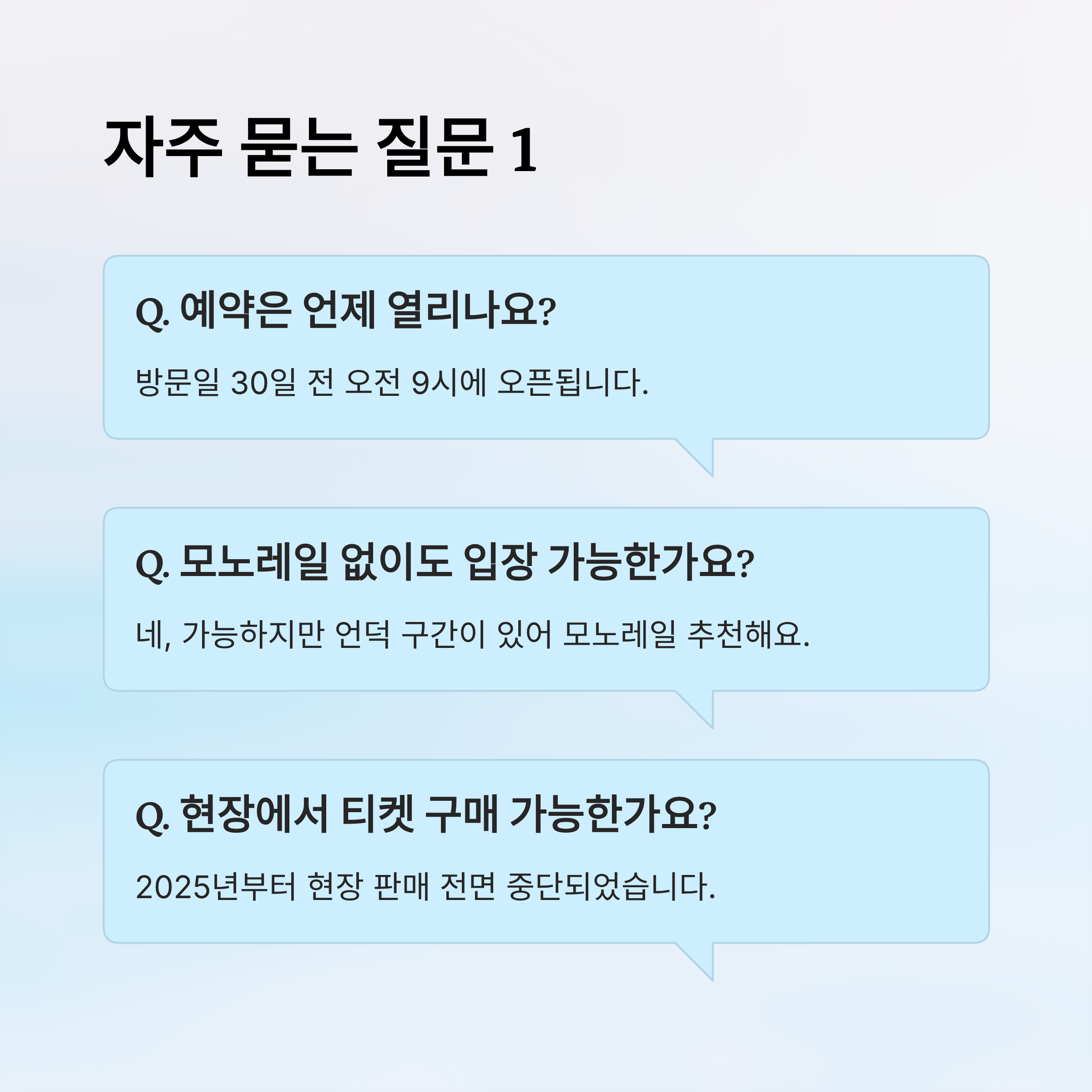 A2. 네, 입장권만으로도 관람은 가능해요. 하지만 언덕 구간이 있어 걷기 어려운 분들은 모노레일 예약이 편해요.
