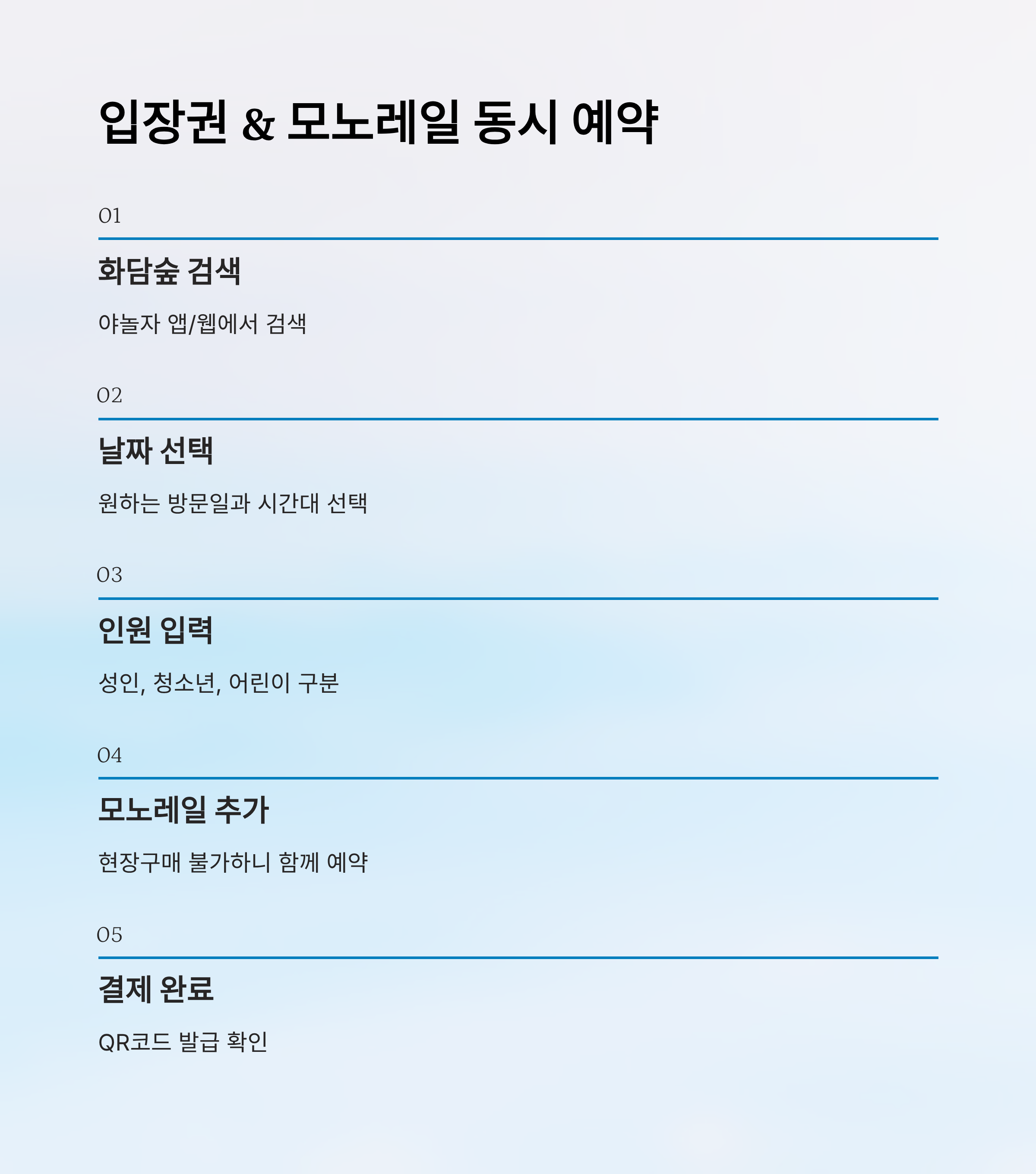 1. 야놀자 앱 또는 웹에서 ‘화담숲’ 검색 2. 예약 가능한 날짜 선택 → 시간대 선택 3. 입장권 인원 수 입력 (성인, 청소년, 어린이) 4. 모노레일 탑승권 추가 선택 5. 결제 및 모바일 QR코드 발급 확인