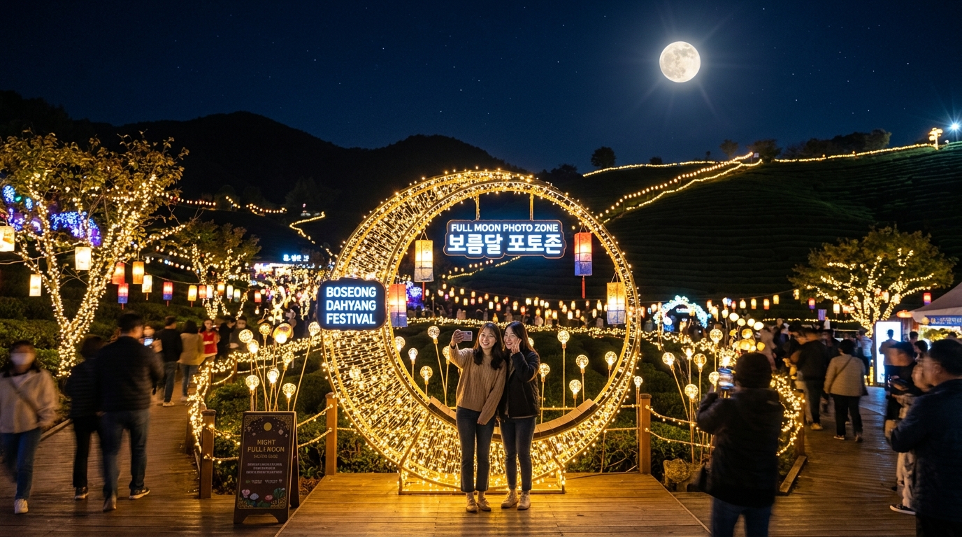 2. 한국차문화공원 보름달 포토존: 밤이 되면 조명이 켜지는 대형 보름달 조형물은 야간 축제의 핵심! 커플 사진 명소로 유명합니다.