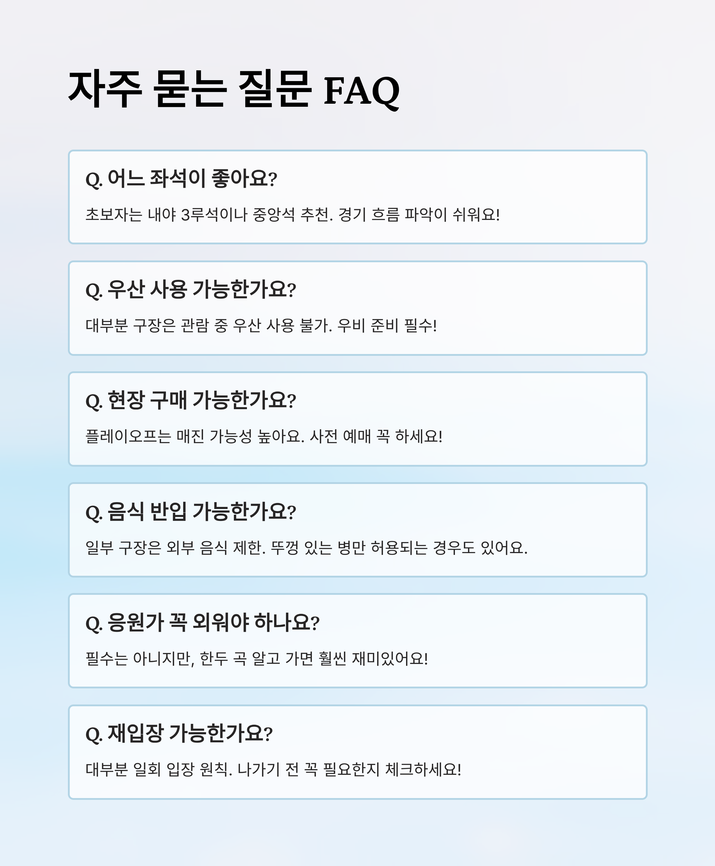 정리하자면, [입장권], [보조 배터리], [모자 또는 우비], [간식/음료], [방석], [신분증] 정도가 기본템이에요. 특히 예매자 명의와 신분증 정보가 다르면 입장이 제한될 수 있으니 주의하세요!