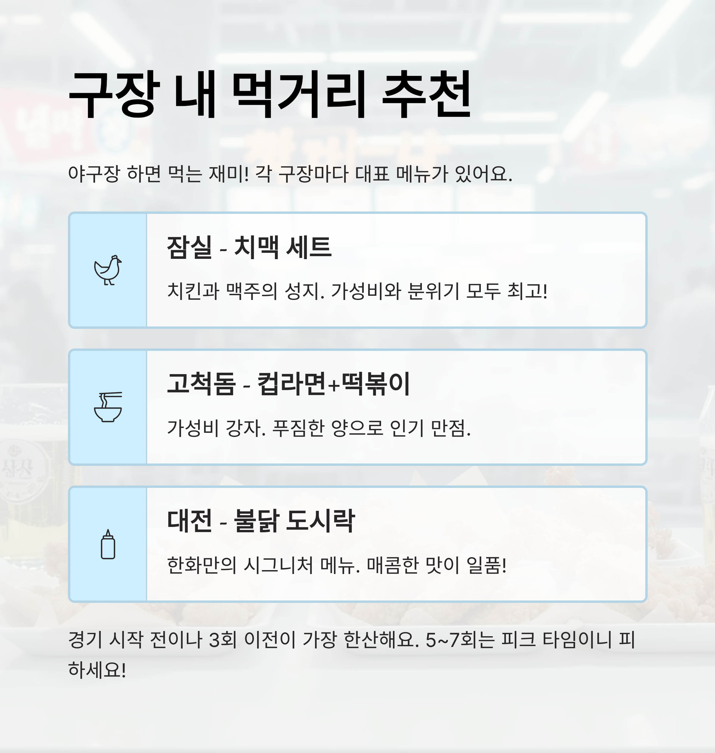 각 구장마다 대표 메뉴가 있는데요, 잠실야구장은 **‘치킨+맥주’**의 성지로 유명하고, 고척돔은 **‘라면+떡볶이’** 조합이 최고예요. 대전 구장은 **한화 불닭 도시락**, 인천은 **씨푸드 핫도그**로도 유명하죠.
