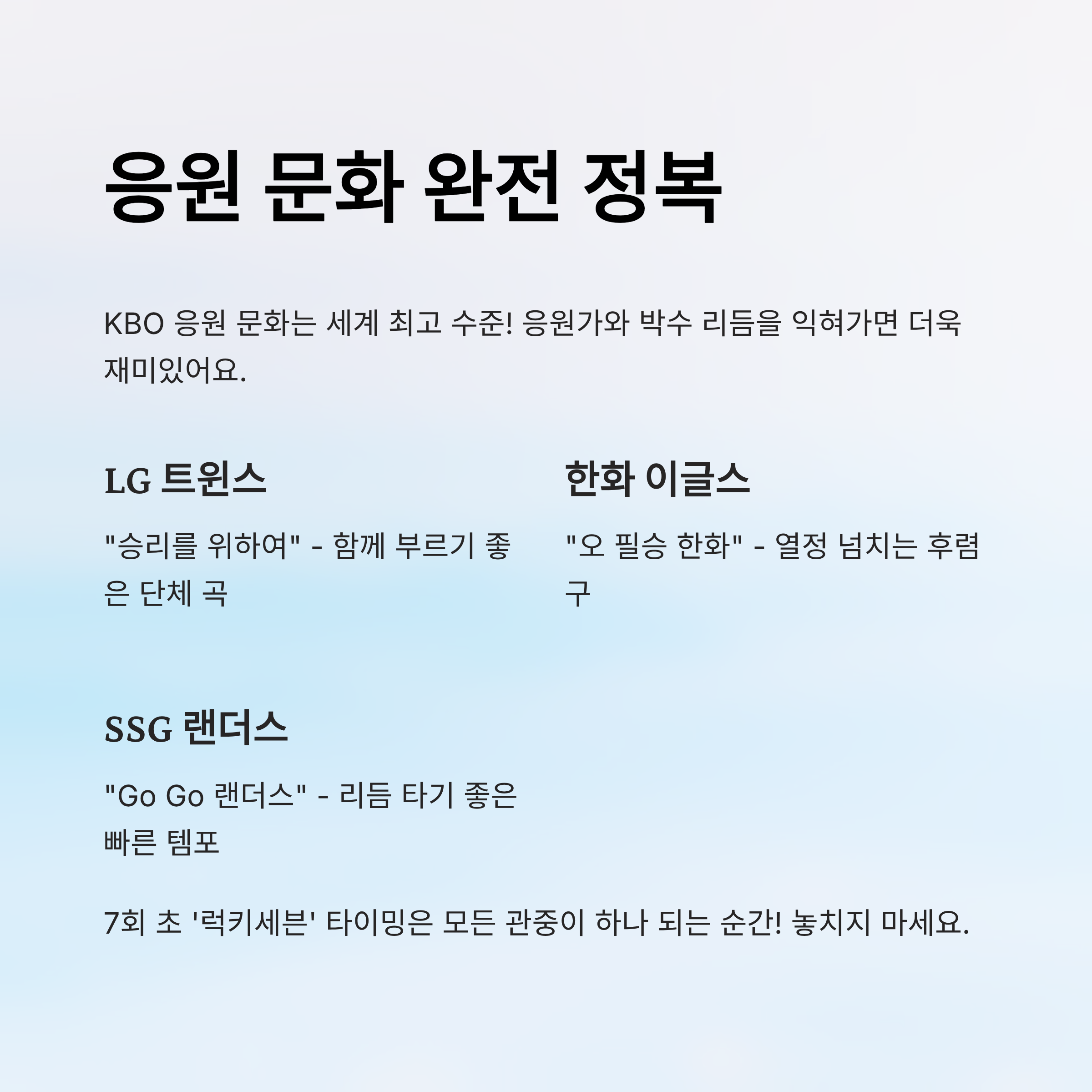 직관에서 진짜 재미를 느끼려면 한 곡 정도는 함께 부를 수 있는 응원가를 외워가는 걸 추천할게요. 특히 7회 초 "럭키세븐" 타이밍의 응원은 모든 관중이 하나 되는 순간이니 놓치지 마세요!