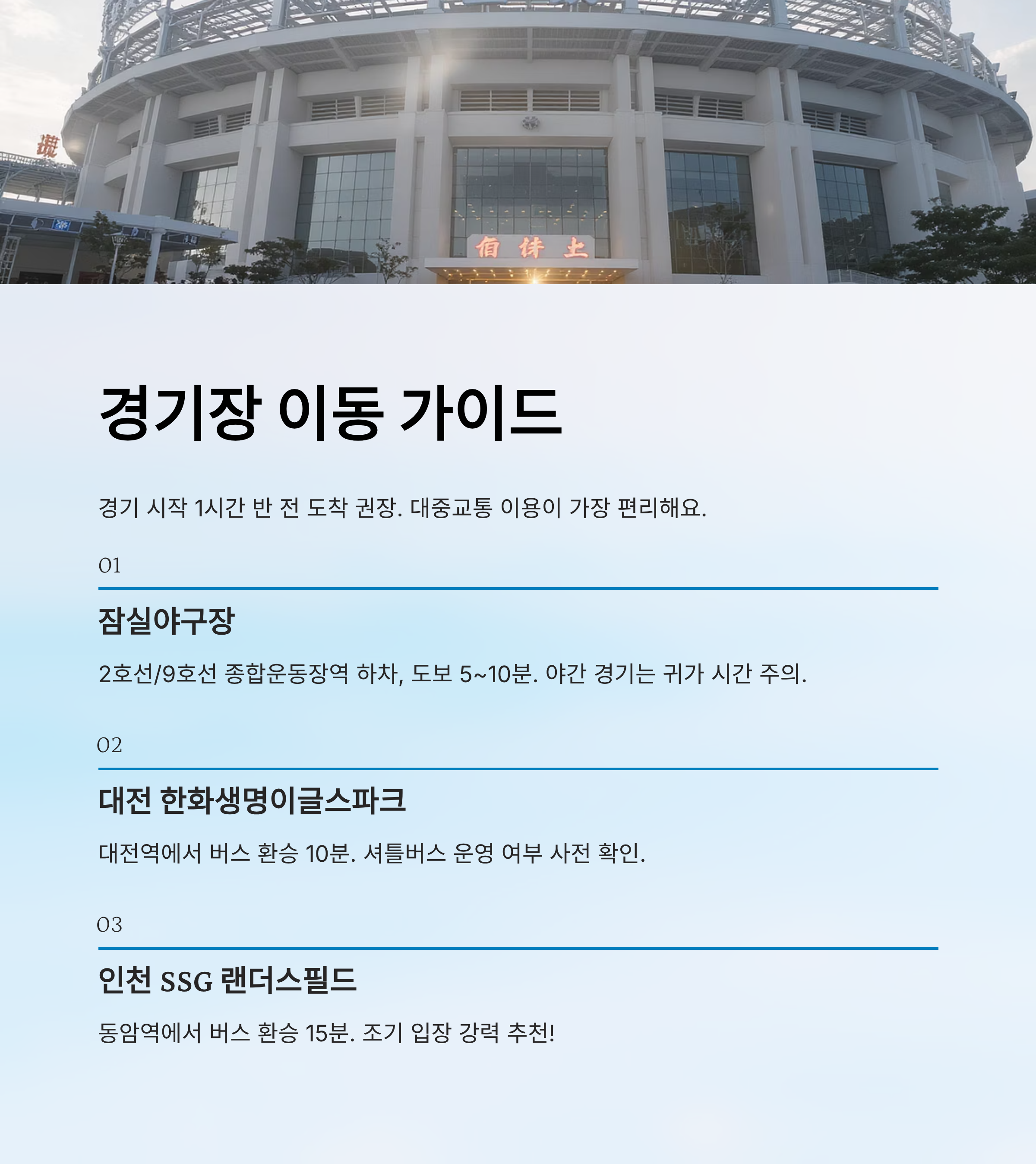 구장에 따라 대중교통과 입장 방식이 다르니, 사전에 검색하고 미리 준비하면 스트레스 없이 이동 가능해요. 📍